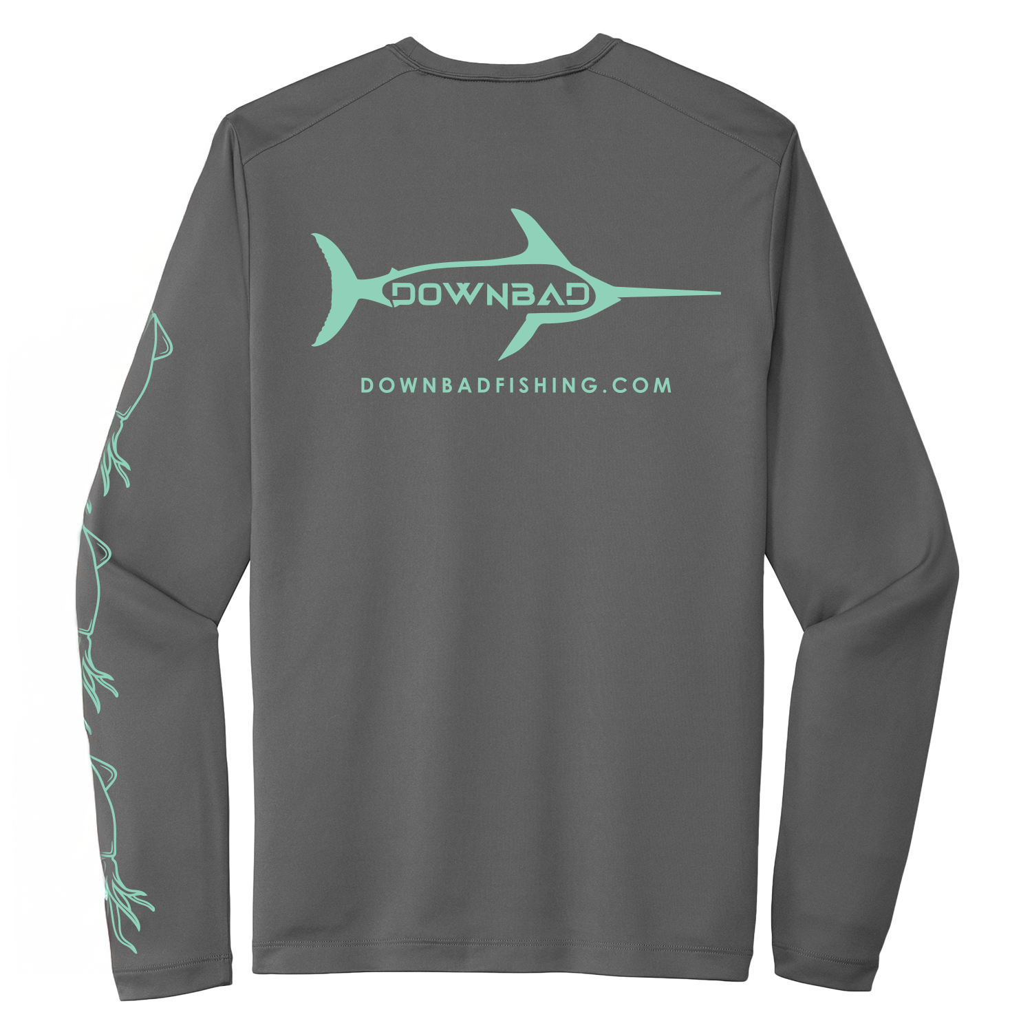 High-end performance long sleeve t-shirt properly branded with the Downbad Fishing center chest logo and center back logo